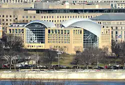 Katherine Gustafson of ArchitectureWeek thought the building "succeeds as a monumental edifice befitting its place in the urban frame of the National Mall" while Nathan Guttman of The Jewish Daily Forward described the headquarters as an "architectural gem."[7][15] Architect Roger K. Lewis, professor emeritus of architecture at the University of Maryland, had mixed feelings about the building. He said it was "most visible and aesthetically enticing after dark", while its "unique, idiosyncratic form appears somewhat less enticing" during the day.[23] During the NCPC meeting in 2007 giving final approval to the building, a National Park Service representative said "This building will be a foreign object in the landscape of classical architecture of this city", criticizing the design compared to the neoclassical and Beaux-Arts buildings along Constitution Avenue.[10] The building is highly visible to commuters on Interstate 66 as they enter the city, a fact lamented by Philip Kennicott, Pulitzer Prize-winning critic for The Washington Post. In two scathing reviews of the headquarters, Kennicott said "If it were not for the roof, the building would be unexceptional, just another exercise in boxy architecture pierced by deadening rows of identical rectangular windows" and "The institute’s design marks yet another low point in Safdie’s long descent into repetitive corporate architecture."[8][10]