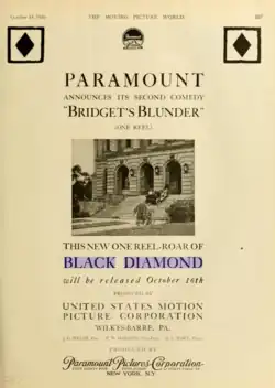 Between October 2, 1916, and November 12, 1917, the United States Motion Picture Corporation produced and released twenty-seven Black Diamond Comedies. "Black Diamond" referred to anthracite coal, deposits of which had made Wilkes-Barre and the surrounding area a center of the mining industry and contributed to the region's wealth. The one-reel silent films were the first comedies distributed by Paramount Pictures, which was then based in New York. Paramount advertised these comedies widely in 1917, sometimes alongside those of Fatty Arbuckle, another Paramount comic artist. The films often followed a comic character named Susie, portrayed by USMPC's leading lady Leatrice Joy, through mishaps and blunders. The films' advertisements that appear in The Moving Picture World magazine note the use of comic special effects, with stop-action and film-speed experimentation.