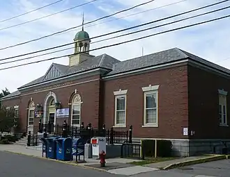 The United States Post Office—Arlington Main is a historic post office in Arlington, Massachusetts. Built in 1936, this Colonial Revival brick structure is most notable for the mural in its lobby, which was painted in 1938 by William C. Palmer, with funding from the Federal Art Project.[2] The building was listed on the National Register of Historic Places in 1986;[1] it had previously been included in the Arlington Center Historic District in 1985.[2]
