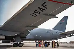 A KC-46A with the service branch designation (USAF) below the wing, low-visibility roundel on the fuselage and national flag on the tail.