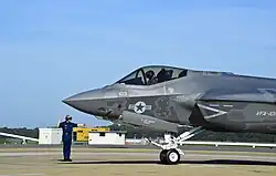A US Navy Lockheed Martin F-35C Lightning II with low-visibility insignia on fuselage.