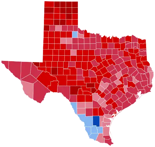 McGovern's only county wins came from the south Texas region along the U.S.-Mexico border and Cottle County in the northern part of the state, though even his performances here were underwhelming. In fact, this is the only election since 1952 in which Dimmit County and Presidio County voted for the Republican candidate. This is also the last election in which Zavala County voted Republican,[3] though that county did so even in 1960. Duval County, however, gave McGovern over 85 percent of the vote, which was the highest percentage of votes he received in any county nationally.[4] 1972 was the third successive election when Duval proved the most Democratic county in the nation. He was the first Republican to ever carry La Salle, Hidalgo, Jim Wells, Willacy, Brooks, Cameron, Kenedy, and Nueces counties (all in South Texas), and the first since 1920 to carry Zavala County; and the first since 1928 to carry Dimmit, Frio, Kleberg, and San Patricio counties. He was the first Republican to carry many historically Democratic East Texas counties as well.