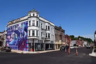 The period of significance for the district covers the years 1856 to 1919, but its historic commercial development occurred during the 1870s and 1880s. The buildings were constructed in brick and are largely two to three stories tall. There are also several single-story buildings and one that is four stories tall. The Italianate and the Queen Anne are dominant.[2] Nine of the buildings are major commercial blocks. In addition to the commercial buildings, there is the two-story, brick, former Fire Engine House Number 1 that faces south at the jog in the street. The buildings in the district are considered some of the best examples of late-19th-century commercial designs in the city.[2]