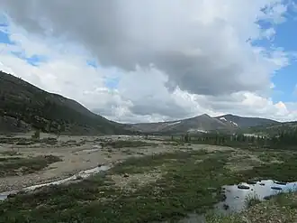 The Upper Kolyma Highlands are located in the upper course of the Kolyma. They are bound in the west by the Tas-Kystabyt and Suntar-Khayata ranges and to the east by the Seymchan-Buyunda Depression to the north and the Ola river basin to the south, with the Maymandzhin Range stretching in between. To the northwest lies the Nera Plateau and in the north the highlands merge with the southernmost chains of the Chersky Range. The Seimkan Mountains and the Igandzha Massif rise to the south, among other minor ranges.[1]