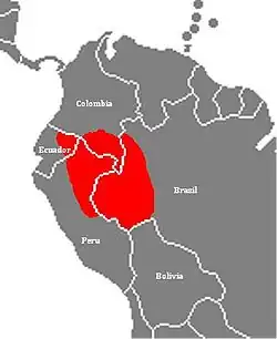 The species has been noted in the lowlands of eastern Ecuador, eastern Peru, northwestern Brazil, and the extreme southern regions of Colombia; they may be found in Bolivia, as well.[3][6]