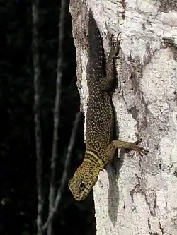 The species is diurnal, active during the daytime.[5] The level of activity exhibited is at least partially dependent on the presence of sunlight. Individuals emerge once the sun comes out, and remain active unless cloud cover reduces sunlight. The rough times of activity are from 8:30 am until 5:00 pm, and males appear to emerge from holes in trees earlier than females and juveniles.[4] Upon emerging from the trees, lizards bask in the sun to raise their body temperature until sufficient heat is absorbed.[4] When approached by humans or startled, the lizards either run into their holes to hide or run out on limbs of the tree to avoid danger.