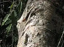 Tropical thornytail iguanas are only found in the Amazon Rainforest, and within it are generally found in lowland tropical rainforest; usually areas with lagoons, rivers, streams, and palm swamps.[4][5] They are an arboreal species, spending the majority of their lives in high treetops.[5] They prefer trees with high horizontal branches that allow for basking in the sun during the morning hours, and are almost only found in trees that contain hollow areas accessible through entrances in the tree branches and trunks.[4] No specific species of tree has been found to be favored by the lizards; apparently the tree structure, rather than the species, determines what the lizards prefer.[4]