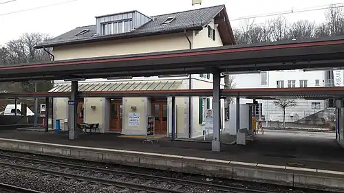 Urdorf is a railway station in the Swiss canton of Zurich.[2][3] The station is situated close to the boundary of the municipalities of Schlieren and Urdorf and, whilst it is actually in the former, it takes its name from the latter. The station is located on the Zurich to Zug via Affoltern am Albis railway line,[4] within fare zone 154 of the Zürcher Verkehrsverbund (ZVV).[5]