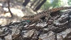 Urosaurus ornatus, commonly known as the ornate tree lizard, is a species of lizard in the family Phrynosomatidae. The species is native to the southwestern United States and northwestern Mexico. The species, which was formerly called simply the "tree lizard", has been used to study physiological changes during the fight-or-flight response as related to stress and aggressive competition.[3][4] Its life history and costs of reproduction have been documented in field populations in New Mexico and Arizona.[5][6] This species has been fairly well studied because of its interesting variation in throat color in males (within a population) that can correlate with different reproductive strategies,[7][8]