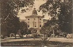 Ursuline High School was established in 1880 at 10th and B Streets in downtown Santa Rosa by eight Ursuline sisters from Brown County, Ohio. At this time the school was called Ursuline College. A liberal arts college was chartered in 1901 by the sisters. Degrees continued to be offered until 1936.[2]