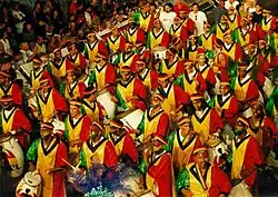 This cultural expression is rooted in the carnivalesque theatre which emprises both religious and civic rituals.[3] In the mid-18th century, Afro-uruguayan enslaved people had one day off to celebrate their own culture and traditions to the rhythm of the drums of Candombe music. In fact, the term "Las Llamadas" (The Calls), which is a traditional carnival dance parade in Montevideo, comes from the call made by the Afro-uruguayan slaves when they wanted to get together in the streets by playing the drums.[4]