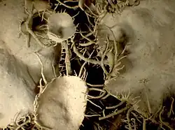 Closeup of apothecia of a herbarium specimen showing fibrils around the disc
