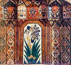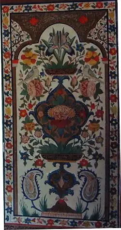 National traditions of wall painting, which is the most valuable legacy of Azerbaijani art, took the main place in the creativity of Usta Gambar Karabakhi. Chased decoration and richness of compositional and color resolutions can be seen in his delicate graphic painting of a complex plant ornament. The painter drew pictures of animals and fantastic beings upon branched ornaments of flowers and plants. The painting also didn't destroy the flatness of the wall, but on the contrary, underlined its constructive architectural details.[7]