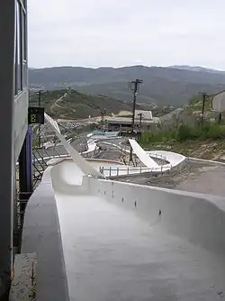 A ceremony on June 3, 1994, signaled the start of construction on the bobsled/luge track.[5] The track was completed December 28, 1996 and its grand opening ceremony was held on January 25, 1997. The very first run on the new track was by luger Jon Owen on January 10, 1997.[6] Following the completion of the track it was decided to reintroduce skeleton as an Olympic event during the 2002 Winter Olympics and plans called to use the track to host all three sliding three events.