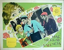Valencia, also known as The Love Song, is a 1926 American silent romance film directed by Dimitri Buchowetzki, who came over from Paramount to direct. The film stars Mae Murray and features Boris Karloff in an uncredited role. The film was a box office hit and the title song, Valencia, was the top song in the U.S. for the year.[1]