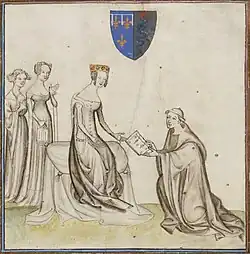 Valentina Visconti receiving Honoré Bonet's Apparicion maistre Jehan de Meun, c. 1398. Illumination on parchment, BnF