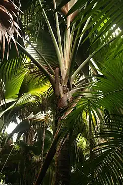 There are five other endemic palm species; millionaire's salad (Deckenia nobilis), thief palm (Phoenicophorium borsigianum), Seychelles stilt palm (Verschaffeltia splendida) latanier millepattes (Nephrosperma vanhoutteanum) and latanier palm (Roscheria melanochaetes). These six species of palms are not only unique to this reserve but also to the Seychelles, and are not found anywhere else in the Indian Ocean in its pristine ancient state of evolution. The forest is dense with Pandanus screw palms and broad leaf trees. Chrysobalanus icaco Cocoplum is also reported. The aesthetic beauty of this natural palm forest is a grand display of an array of green, red and brown palm fronds.[2] Some amount of supplementation has occurred in the plantation of these species of palms with the only intent of maintaining the ecosystem.[9]