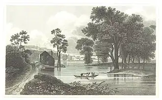 In the 1800s the island became the site of the Boston and Albany Railroad's (B&A) passenger depot, shops, freight houses, round house, and coach yard. The island was the site of transfers between trains of the New York Central and the B&A. The island became known as the Boston and Albany Island, or just Boston Island. A ferry transported people to and from the island and downtown Albany at Maiden Lane. The railroad changed the shoreline of the island by building docks for receiving coal and grain and by dredging an east–west channel splitting the island in half. In 1871 the Maiden Lane Bridge was built replacing the ferry. When the NY Central and the B&A merged in 1900 the island's activities became less important, though a new round house and coach yard was built even as many buildings were demolished. In 1903 the channel that separated the island from the mainland was filled in with sand dredged from the bottom of the Hudson River.[1] Also in 1903 the New York Central and Hudson River Railroad purchased outright the island from the van Rensselaer family for $6,000.[9]