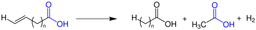 The Varrentrapp reaction, also named Varrentrapp degradation, is a name reaction in the organic chemistry. It is named after Franz Varrentrapp, who described this reaction in 1840.[1] The reaction entails the degradation of an unsaturated carboxylic acid into a saturated acid with two fewer carbon atoms and acetic acid. The fragmentation is induced by action of molten alkali.[2]