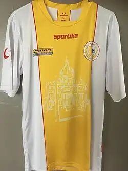 In the past, the kit has been provided by Diadora. The shorts were all white while the top is solid yellow with a narrow blue and white line around the right upper quadrant of the body.[31] The team's kit was then provided by Sportika SA until July 2021. The kit had an image of Saint Peter's Basilica ghosted on the front.[32]