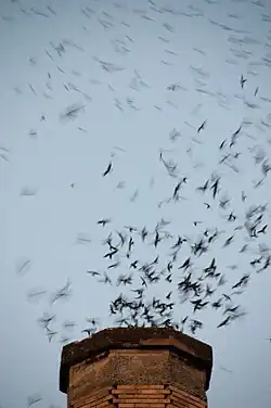 A migratory population of Vaux's swifts roost each Autumn in the old brick chimney of Chapman Elementary School in Northwest Portland, Oregon. They are locally and regionally known as "Chapman swifts" in part because packing thousands of birds into a brick chimney each evening, is a visual treat that draws large crowds.[7]