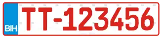 Bosnia and Herzegovina vehicle registration plates have held their current form since 2 February 1998.[1] Currently the Bosnia and Herzegovina (BiH) vehicle registration plate format consists of seven characters: five numbers and two letters arranged in the following order: X00-X-000 (taxis: TA-000000). The plates are uniform across the country and do not denote the place (town, municipality, canton, or entity) where the vehicle is registered, as was the case prior to 1998. Likewise the plates do not contain any heraldic symbols. The plates use only letters which are represented equally in Latin and Cyrillic script (A, E, O, J, K, M, T).