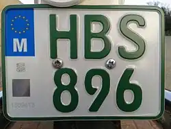 Maltese registration plates are the number plates used within Malta to uniquely identify motor vehicles. Since 1995, the three letter, three number system (ZZZ 999) has been in use in Malta for vehicle registration. The characters are always printed in black on a white background, and to the left one can find a blue box with the Flag of the European Union and the letter M (for Malta) underneath it in white. The typeface used on Maltese registration plates is FE-Schrift which is also the typeface used on German vehicle registration plates.