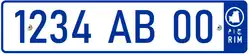 The license plates of Mauritania feature a white background with a blue label. The plates start with four digits, followed by two letters and end with a two-digit number. This combination provides information about the specific area where the vehicle is registered (e.g., "00" for Nouakchott). On the right side of the plate, there is a representation of Mauritanian license plates based on the Euro plate design. This includes a blue bar displaying a circular outline of the country and the distinctive "RIM" abbreviation (French: République Islamique de Mauritanie - Islamic Republic of Mauritania) in both Arabic and Latin letters. In older license plates, the blue bar is not present, and only the letters are displayed.