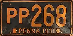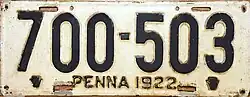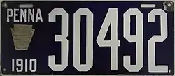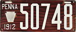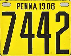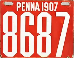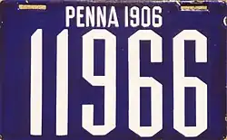 The U.S. state of Pennsylvania first required its residents to register their motor vehicles in 1903. Registrants provided their own license plates for display until 1906, when the state began to issue plates.[1]