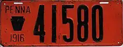 1916 Embossed black on orange; "PENNA", keystone and "1916" at left 123456 1 to 19999;