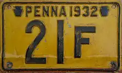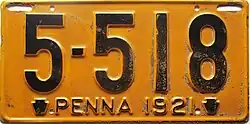 1921 Embossed black on golden yellow; "PENNA 1921" at bottom, with keystones on either side 123-456 1 to approximately 634-000