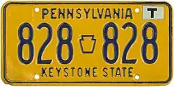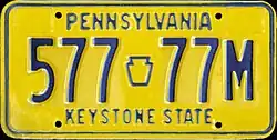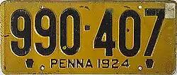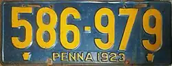 1923 Embossed golden yellow on navy blue; "PENNA 1923" at bottom, with keystones on either side 123-456 1 to approximately 986-000 Six-digit plates were originally 16 inches in length, but reduced to 15 inches later.