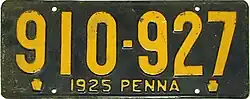 1925 Embossed golden yellow on navy blue; "1925 PENNA" at bottom, with keystones on either side 123-456 1 to 999-999