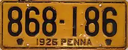 1926 Embossed navy blue on golden yellow with border line; "1926 PENNA" at bottom, with keystones on either side 123-456 1 to 999-999