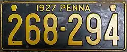1927 Embossed golden yellow on navy blue with border line; "1927 PENNA" at top, with keystones on either side 123-456 1 to 999-999