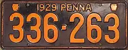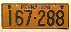 1929 Embossed golden yellow on navy blue with border line; "1929 PENNA" at top, with keystones on either side 123-456 1 to 999-999