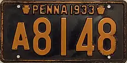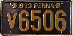 1933 Embossed golden yellow on navy blue with border line; "PENNA 1933" or "1933 PENNA" at top, with keystones on either side 12345