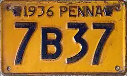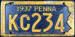 1937 Embossed golden yellow on navy blue with state-shaped border; "1937 PENNA" at top 12345