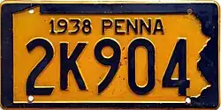 1938 Embossed navy blue on golden yellow with state-shaped border; "1938 PENNA" at top 12345