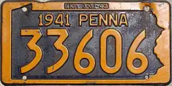 1941–42 Embossed golden yellow on navy blue with state-shaped border; "1941 PENNA" at top; "EXP. 3-31-42" inside top border 12345