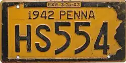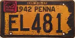 1942–44 Embossed navy blue on golden yellow with state-shaped border; "1942 PENNA" at top; "EXP. 3-31-43" inside top border 12345