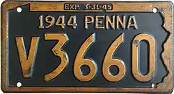 1944–45 Embossed golden yellow on navy blue with state-shaped border; "1944 PENNA" at top; "EXP. 3-31-45" inside top border 12345