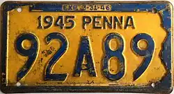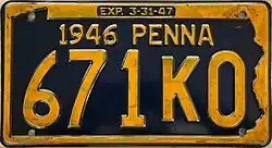 1945–46 Embossed navy blue on golden yellow with state-shaped border; "1945 PENNA" at top; "EXP. 3-31-46" inside top border 12345