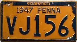 1946–47 Embossed golden yellow on navy blue with state-shaped border; "1946 PENNA" at top; "EXP. 3-31-47" inside top border 12345