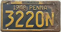 1948–49 Embossed golden yellow on navy blue with state-shaped border; "1948 PENNA" at top; "EXP. 3-31-49" inside top border 12345