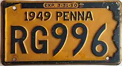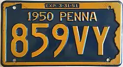 1949–50 Embossed navy blue on golden yellow with state-shaped border; "1949 PENNA" at top; "EXP. 3-31-50" inside top border 12345