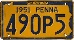 1950–51 Embossed golden yellow on navy blue with state-shaped border; "1950 PENNA" at top; "EXP. 3-31-51" inside top border 12345