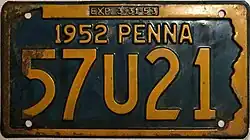 1951–52 Embossed navy blue on golden yellow with state-shaped border; "1951 PENNA" at top; "EXP. 3-31-52" inside top border 12345