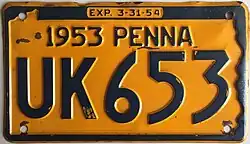 1953–54 Embossed navy blue on golden yellow with state-shaped border; "1953 PENNA" at top; "EXP. 3-31-54" inside top border 12345