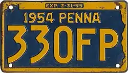 1954–55 Embossed golden yellow on navy blue with state-shaped border; "1954 PENNA" at top; "EXP. 3-31-55" inside top border 12345